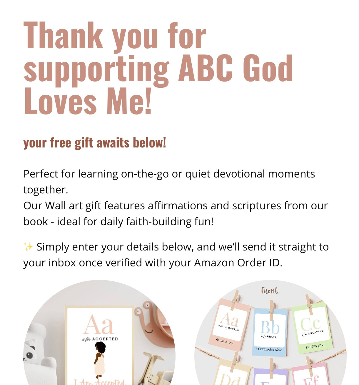Thank you for supporting our mission! If you’ve purchased our A–Z Biblical Affirmations Book: ABC God Loves Me, you can now access free affirmation wall art as our heartfelt gift to you.